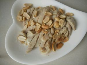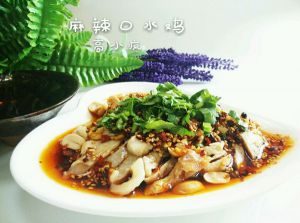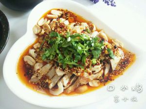 把2勺鸡汤加入调味汁中拌匀,浇在鸡块上,再撒上花生碎和芝麻,香辣诱人的口水鸡就做好了。