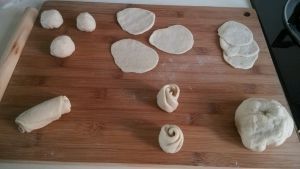 闲着没事也可以给馒头们凹个造型,随意取3个小面团,擀薄或压扁,叠起来再卷起来,残忍地从中间切断,就做好两朵花了。擀的不圆压得不薄都没关系,等蒸好了,这么胖乎乎的馒头长什么样都是呆萌惹人爱的,实在介意就告诉别人这是我家小宝贝捏的。