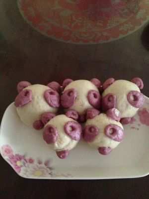把紫薯面弄成眼睛和嘴,贴到白色面团上,放锅里蒸上15分钟到18分钟,