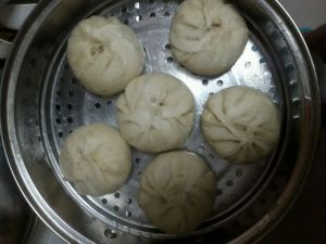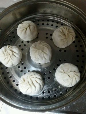 加一小勺碱,放碱是最考验功夫的,多了发黄,少了发酸,我一般加碱后揉一会儿,再闻闻面团,没酸味就是够了,然后一直揉,把碱揉散,一般要揉15-20分钟,不揉散会有黄斑,揉的时候尽量少放干面粉,因为干面粉都是未经发酵的,放得越多馒头越硬。揉好搓成长条切成小块,要是做馒头,就可以直接上锅蒸了,做包子的话就压扁擀成片包馅。做好就上蒸锅,家里没蒸布,就在锅里涂了油,以免粘锅,水开后先最大火蒸5分钟,之后调稍小(煤气灶外圈有火的最小点)蒸10分钟。