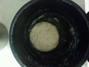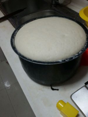 等它发至两到三倍大小,发过一点也没关系,发的时间跟气温有关,夏天三五个小时,冬天可能要发几天,我这次是在22度的天气,发了一夜。发好后加水,想发多一点就加多一点水,我加了一大碗水,把面泡散过用筷子弄散。