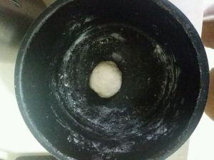 买回来的甜酒,舀两勺汤(有一点酒糟粒也没关系)加上适量面粉和成面团,放在容器中,盖上盖子以免表面干掉。