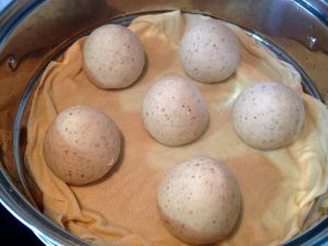 搓圆后用拇指在底部轻轻挤几遍,中间形成一个窝状。反过来整理圆形,不用大力挤压,有少许空隙不碍事,蒸过后会自动密封的。