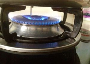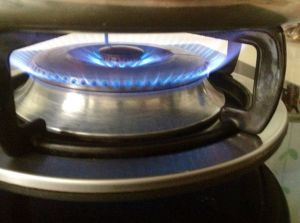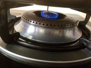 上满气后,(如图)调中火!火苗为刚接触锅底、中间。
