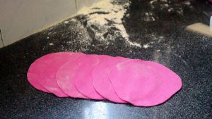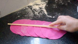 取一个小剂子用手压扁,用擀面杖擀成圆片