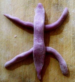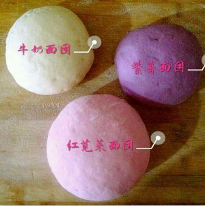 然后用紫薯泥,红苋菜汁,还有牛奶分别加入小麦面粉和适量酵母,白糖一起和成面团,盖上保鲜膜放太阳下发酵