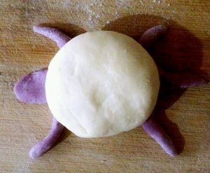 取白色面团里面包上豆沙收口朝下当海龟的身体,记得擦点水粘的更牢固
