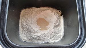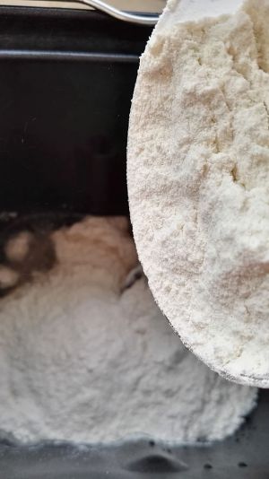 尽量让面粉覆盖整个水面,面粉上扒一窝,放入1.5小勺酵母。