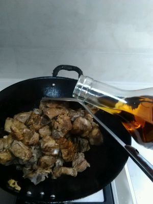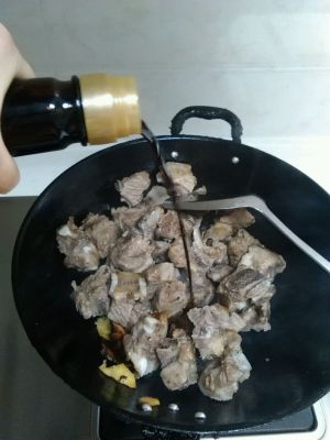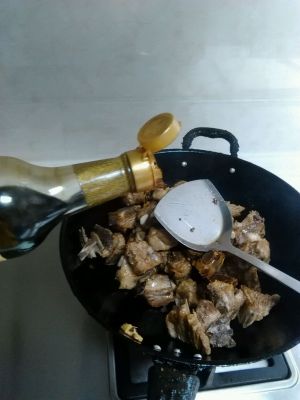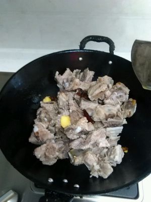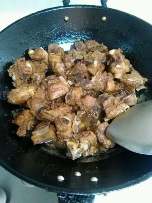 放入焯好的排骨翻炒,这时会听到排骨中的水分滋滋做响,不停翻炒,待水分煸的基本上干了,排骨表面开始微微发黄、出油。