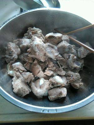 锅内倒水,水开后放入排骨放入适量料酒。开锅后把溢出的漂浮物搭理干净。然后把排骨捞出用清水再洗两遍。
