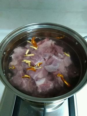 将排骨洗净,凉水下锅,放入洗净的陈皮。
