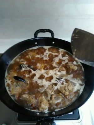 翻炒片刻待上色均匀后加入没过排骨的足量的开水,记住一定是开水,大火煮十分钟左右加盖中小火炖煮40分钟。