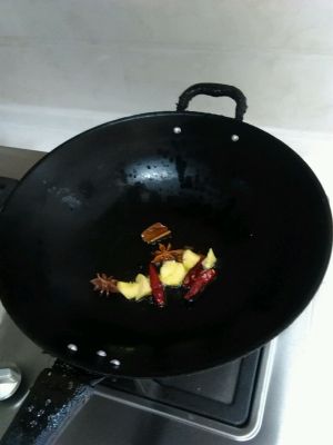 依次加入葱 姜 蒜 辣皮子 酱油 老抽 料酒 大象 花椒 桂皮 继续翻炒五分钟 入味