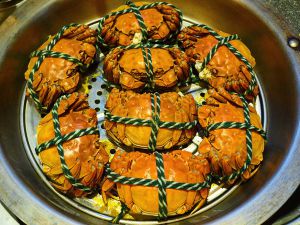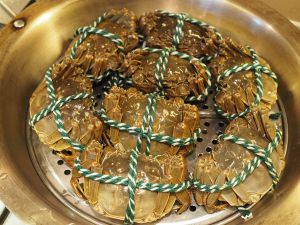 大闸蟹洗刷干净,捆绑大闸蟹的绳子不要解开。