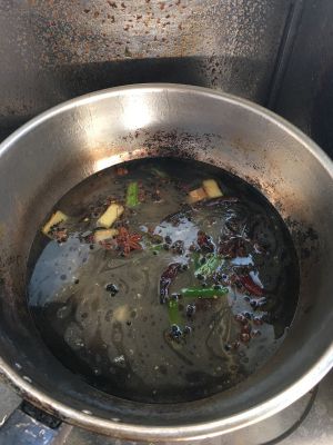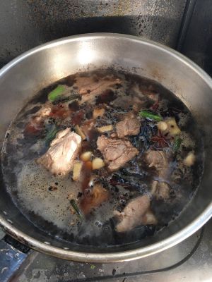 排骨焯水备用!热油下八角生姜片,炒香、放排骨下去炒2分钟,放生抽老抽各一点上色