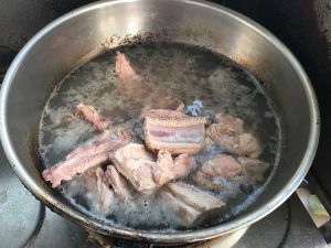 用烧开的水将排骨倒入,戳掉排骨中的血水