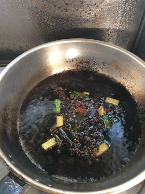 放入准备好的干辣椒和葱白段加入适量清水,放入白糖、味精、盐(视情况添加)盖上锅盖小火慢炖,等锅内汤汁浓郁时便可出锅。因为之前炸过所以不需要煮太久。ps:家里的是电磁炉所以比较慢,燃气灶应该更简单快速一些。喜欢辣的可以把干辣椒剪开,不喜欢的就整个丢进去也成。