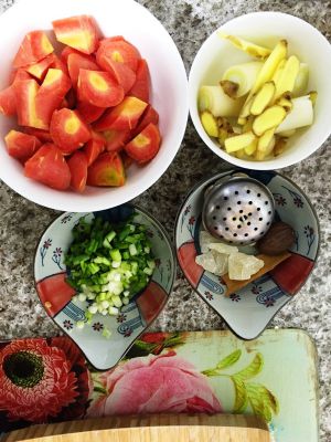 红萝卜切滚刀(土豆也可以哦)葱花.冰糖.调料盒里放入花椒粒和八角.桂皮一块.草果一个.