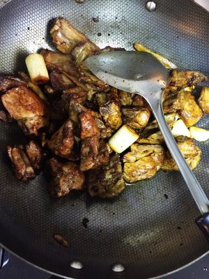 锅内放油,把排骨煎炒5分钟左右,放入前面准备的调料和红烧酱油以及料酒,配料里的一勺如图所示基本上就是家里的汤勺。炒至上色