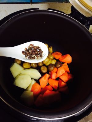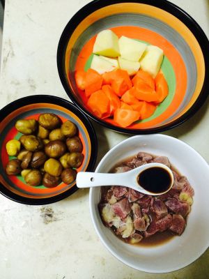 两人份:胡萝卜1颗,小土豆1只,炒栗子剥1小碗(大概20个),牛腩1/2斤。 牛腩热水烫过后腌制10分钟:加2勺黄酒,1勺生抽,1勺白糖,1勺食盐