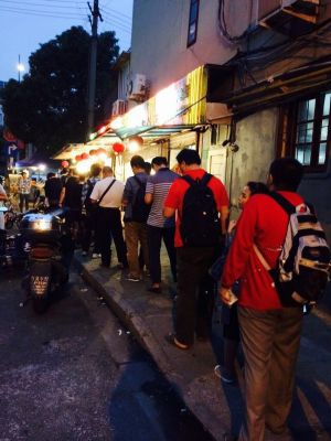 插一张和老公一起排队买糖炒栗子的照片,真的排很长的队,没骗你吧。
