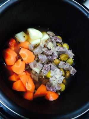 10分钟后腌制好的牛腩和汤一起入高压锅,加点水,水量刚好没过牛腩。(不要加太多水,红烧不需要很多汤汁,出来的味道才香浓) 高压锅设置炖肉档,半小时就好。10分钟的时候高压锅已经滋滋喷气了,老公说好香啊!