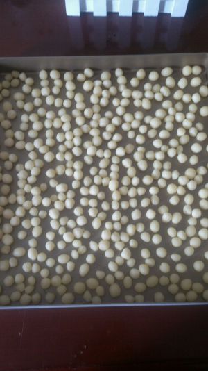 将面团分割,揉成一粒粒的小馒头,这个过程比较漫长,慢慢来哟!将小馒头摆入烤盘中,尽量分开,不然会黏在一起