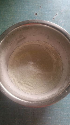 将粉类混合均匀,马铃薯淀粉、低筋面粉、奶粉、泡打粉混合