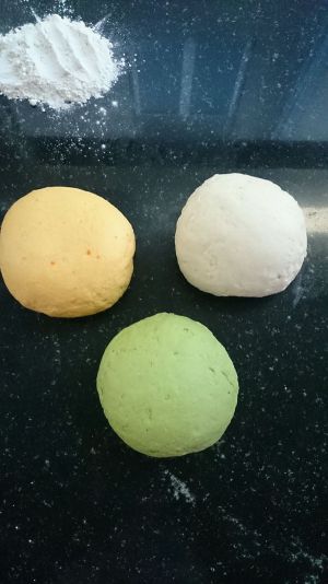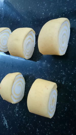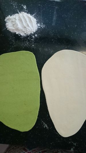 白面团和彩色面团分别撒干粉擀成长方形片,两片重叠一起再擀一下,然后卷成长条(宽边卷)