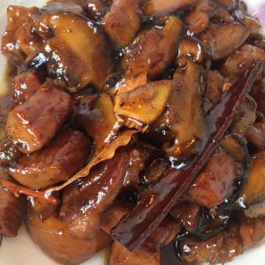 将炒好的五花肉倒入,迅速翻炒使肉裹上糖色,然后倒入料酒+味达美+蚝油+十三香+葱段姜片+香菇翻炒均匀加入水没过五花肉,大火烧开后转为小火盖上锅盖煮。