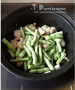 加入一半蒜碎 和豆角 煸炒至豆角变色加入之前炖排骨的汤