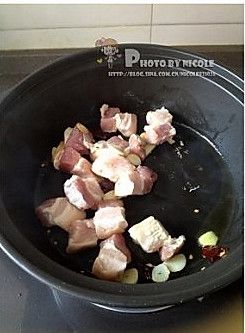 锅里放油,烧热(不能等到冒烟),放葱姜炝锅,放肉炒香;