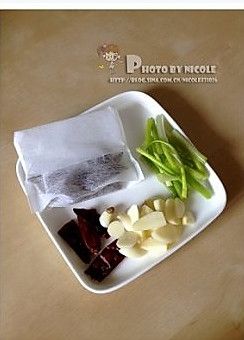 花椒、八角和草果放入茶包袋,干辣椒切段,蒜切片,葱切段;