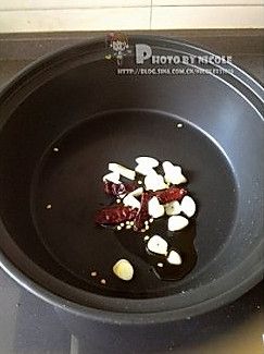 另起锅,加少许油,油烧热后放入蒜片和干辣椒段;