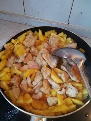 热锅!加油!放入姜!葱爆香!加入番茄酱!将菠萝和肉!下去反超!!加盐!耗油!胡椒!