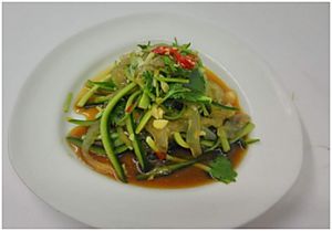 黄瓜切成粗0.5厘米、长5厘米的丝,香菜切成2厘米的段,小泰椒切成圈,蒜肉切成蒜片备用;