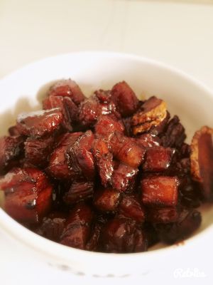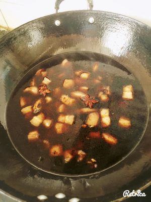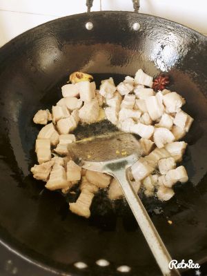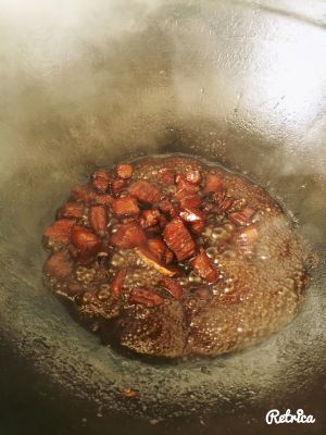 锅内烧干水分,倒入食用油(小火)油稍热后加入冰糖,用铲子搅动化开。加入备好的肉不停翻炒。