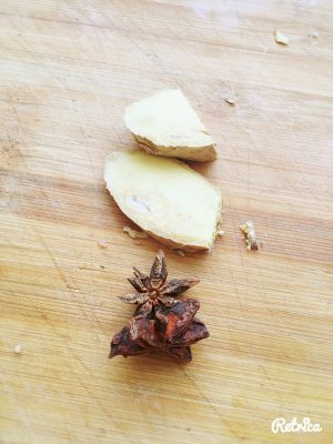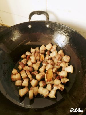 放入姜,八角爆香,再倒入猪五花使劲翻炒