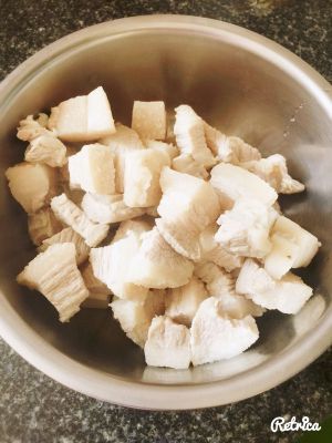 里外三层五花肉,切2-3厘米见方小块,洗净后放水中焯一下之后冷水过一遍,控干水分备用。