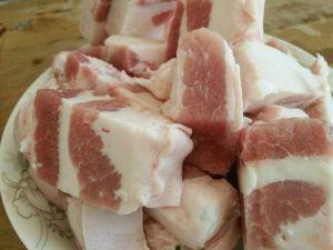 五花肉倒入锅中翻炒,到料酒,老抽,白糖,添少许水,小火慢炖50分钟