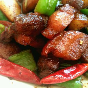 放入适量油,油开后,放入肉墩,待肉有焦黄色是清掉一部分油汁,放少许酱油上色,加水(刚刚淹没肉块即可)放入姜,冰糖,料酒,干辣椒,以及盐,味精,花椒,翻炒收汁,最后放入葱蒜