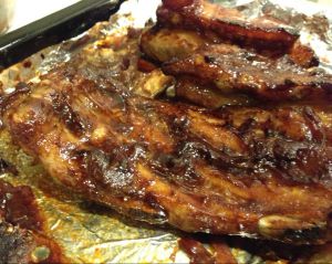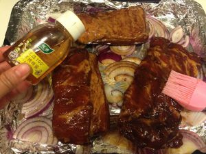 经过40分钟的烘烤之后我换了一张锡纸。第一面又刷了酱汁跟蜂蜜烤3分钟。接着又翻面又刷酱汁跟蜂蜜烤3分钟。我用的烤箱是ACA北美电器RH32HM。很棒。