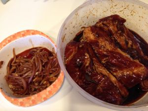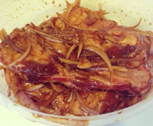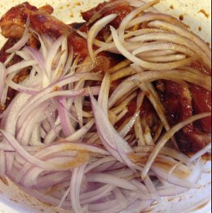四个小时候把洋葱丝挑出来,在肉里面加入甜面酱继续放冰箱腌制两小时,当中同样依次翻身。