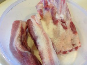猪五花洗干净去皮晾干,和肋排一起擦上糖,我喜欢用手揉搓,大概五分钟,你会发现糖融化的同时,肉仿佛更漂亮了!