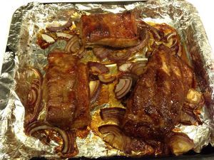 把猪五花和排骨铺在洋葱上刷上腌制的汁,然后再刷上蜂蜜,进烤箱上下火230度烤25分钟。
