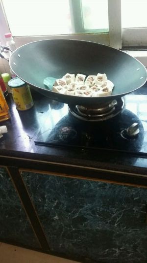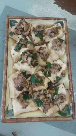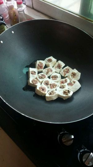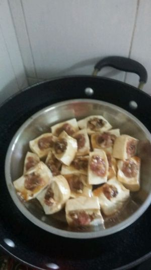 酿好后下锅剪至有点金黄色放一点点水盖上锅盖煮一下 快好放点生抽就可以出锅了