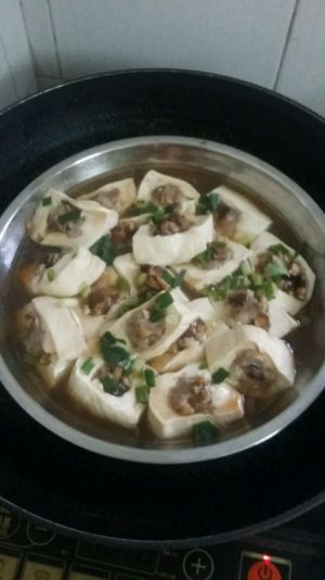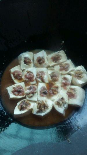 锅里放油,油五成热,把酿好的豆腐放入锅中,中火两分钟放入蒜末,炸一分钟,放入水没过豆腐一半,然后盖锅盖小火煮8分钟