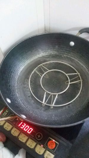 倒一大勺花生油进去,开小火开始慢慢煎,煎的过程中要把锅上下移动一个一分钟要摇晃锅子,好受热均匀。