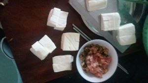 1.首先将肉酱拌好,放入胡椒粉,少许盐,少许味精,姜沫,芋头磨成泥,混合在一起 。豆腐切成三角形,然后中间划开,将肉酿入豆腐中。