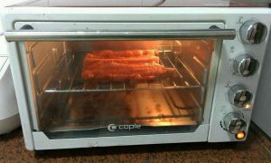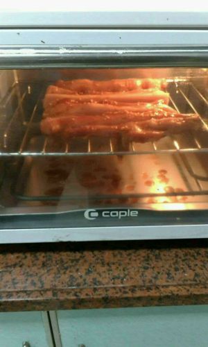 烤箱预热同时,将腌制好的猪肉条均匀地放在烤盘中。确定东菱电烤箱的调温旋钮在“200 度”,功能旋钮在“上下管加热”,将时间旋钮拨动至30 分钟(或者按下“烘烤”键,通过“时间/ 温度”的上下键以及“定时“键把温度调整为200 度、时间调整为30 分钟)。将摆放了猪肉条的滴油碟及烤盘放入烤箱炉腔内,关上烤箱的玻璃门,进行烤制。